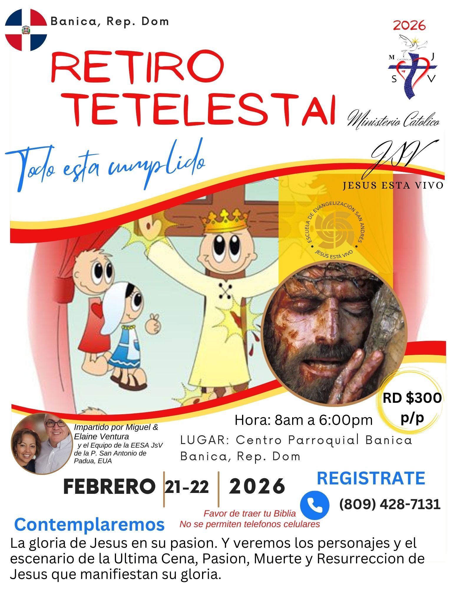 Estaremos impartiendo el Retiro Tetelestai en preparacion para la Semana Santa en el Centro de Retiros de Banica, Rep. Dom.  Estaremos en la Parroquia del P. Steve McGraw de nuestra Diocesis de Arlington, VA.  Quien fue parroco de la P. San Antonio de Padua y estuvo de Capellan en Christodem College.